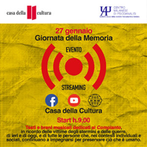 In occasione della Giornata della Memoria, il Centro Milanese di Psicoanalisi, in collaborazione con la Casa della Cultura, propone l’ascolto di brani di musica dedicati al Compianto, nel ricordo delle vittime degli stermini e delle guerre, di allora e di oggi, e delle persone che, nei contesti individuali e sociali, continuano a operare per preservare ciò che è umano.