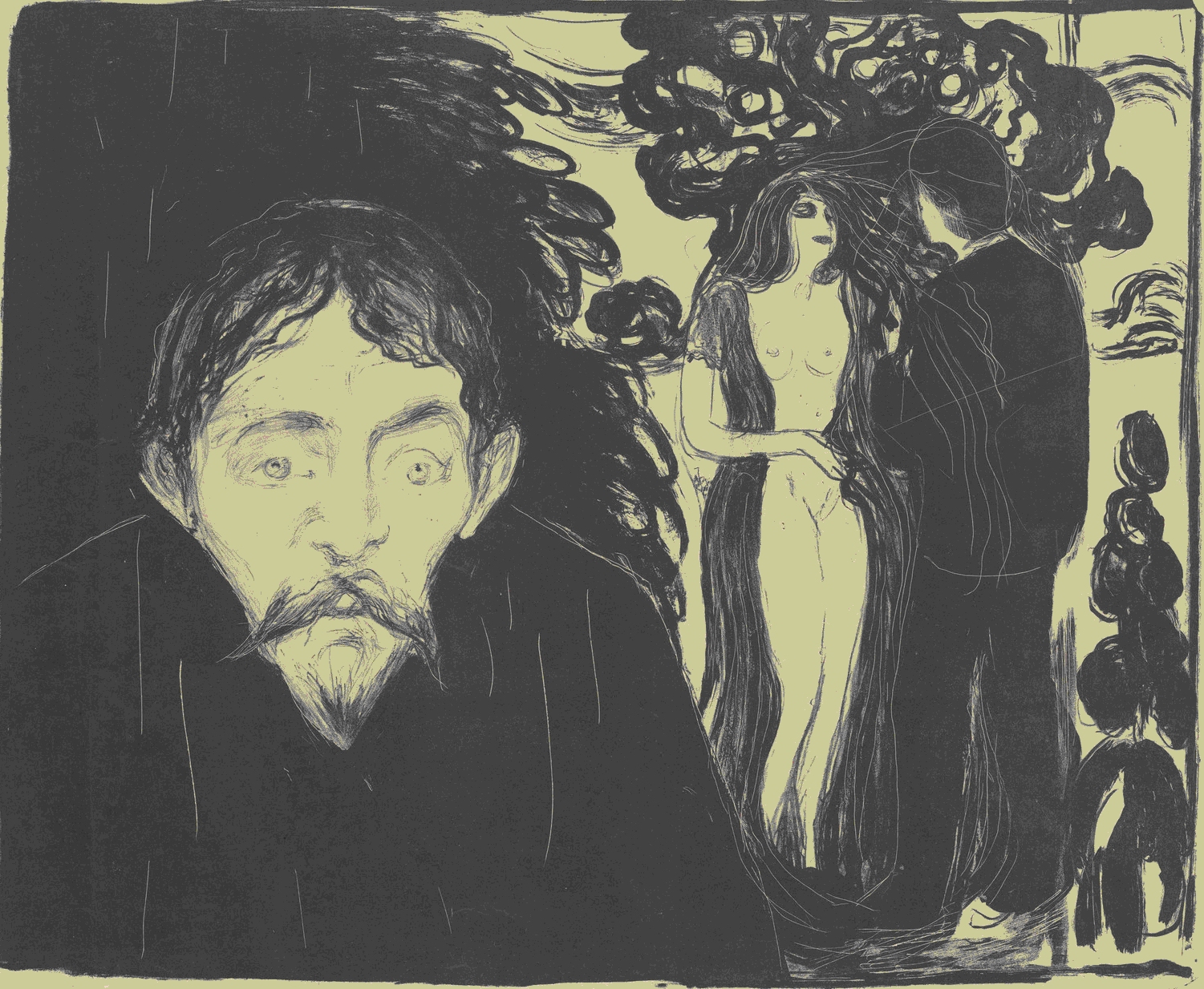 È un tema ricorrente nell’opera di Edvard Munch. Dal 1895 agli anni ’30 egli dipinge almeno quindici versioni del celebre dipinto Gelosia, utilizzando tecniche differenti. Tutte sono variazioni dello stesso scenario: lo sgomento di un uomo ai margini, una donna oggetto di desiderio, un altro uomo, presenza destabilizzante e perturbante. Uno sguardo misterioso quello dell’uomo geloso, indagatore, interessato, pieno di odio e d’amore. La ripetizione rappresenta il tentativo dell’artista di elaborare un drammatico vissuto personale, ma anche la complessità e la natura mutevole della gelosia.